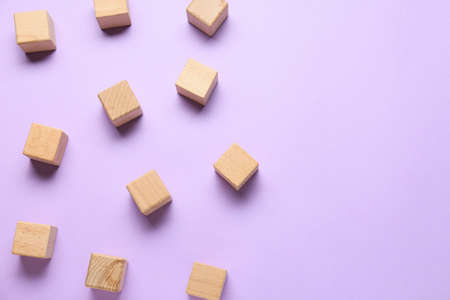 Children's wooden cubes on a white background. Colored cubes for kids. The children's construction set is scattered on white.