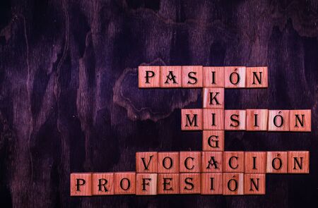 Top view close up shot of various words arranged with wooden chips on Pink Background