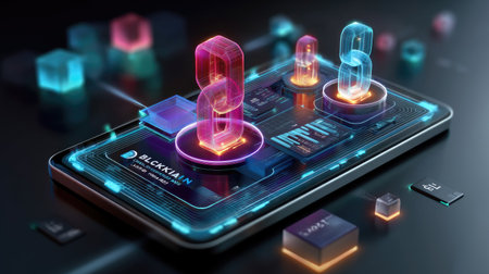 This image showcases a futuristic interface concept on a digital device, illustrating innovation in technology and data analysis with vibrant holographic elements.