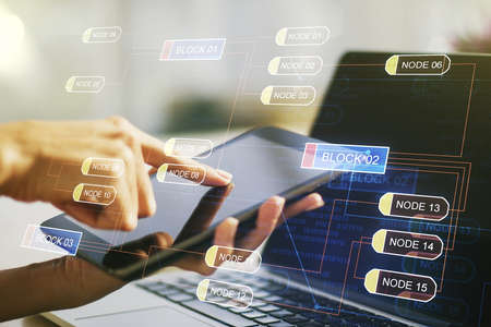 Creative concept of blockchain technology and hands typing on laptop on background. digital money transfers and decentralization concept. Multiexposure