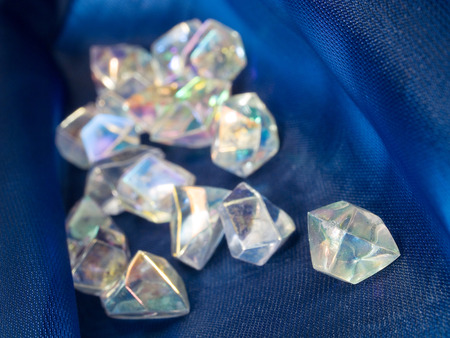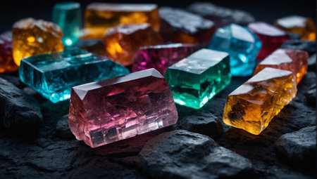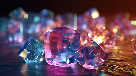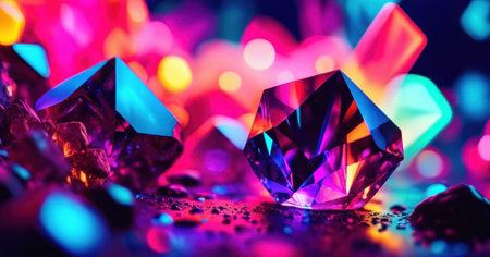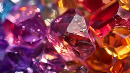 A close-up view of sparkling crystals reflecting vibrant colors against a soft bokeh background. The composition highlights the intricate textures and brilliance of the gems, creating a stunning visual experience.