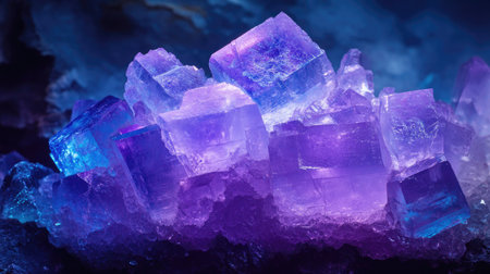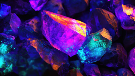 High-detail macro shot depicting rare earth mineral crystals illuminated under ultraviolet light. the crystals exhibit striking hues of green, blue, and purple, showcasing their unique luminescence and intricate structures.
