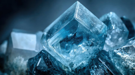 Blue fluorite crystals interlaced with baryte, displayed in macro detail, shimmering with a mysterious, icy blue glow.