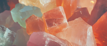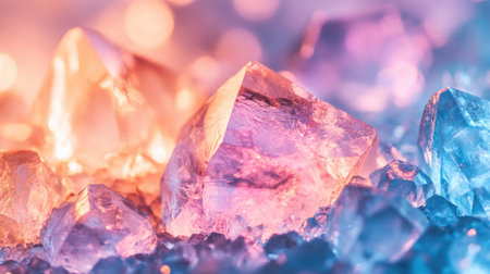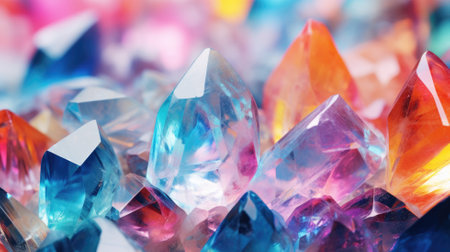 A mesmerizing close-up of colorful crystals showcases their vibrant hues and intricate facets, creating a dreamy and serene atmosphere. The soft bokeh enhances the artistic effect, perfect for backgrounds or design projects.