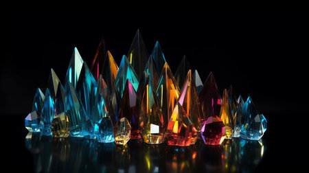 Sparkling multicolored mineral crystals with light rays isolated on black background. AI generated illustration