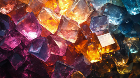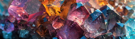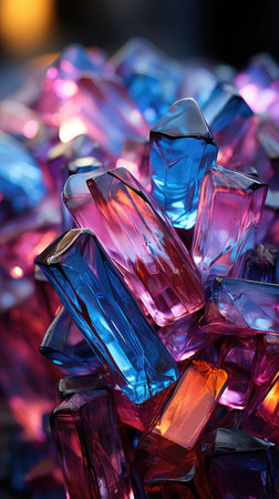 This captivating image showcases a selection of vibrant crystals illuminated in blue, purple, and orange hues, creating a mesmerizing visual effect.
