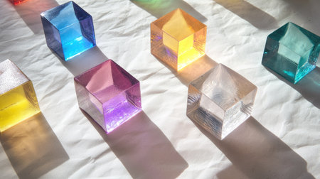 Light spectrum from dichroic glass cubes, creating a sparkling effect on white textured paper in an artistic display.