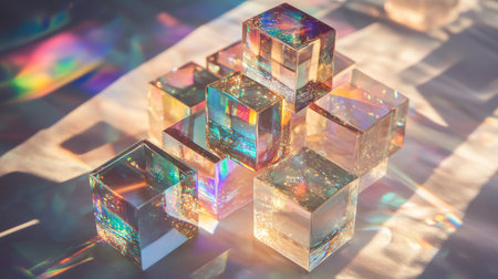 Stack of dichroic glass cubes dispersing artificial light into multiple spectra, with sparkling reflections on textured white paper.
