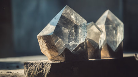 Geometric crystals displayed on a rocky surface, illuminated by sunlight, showcasing their natural beauty and intricate design.