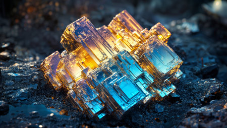 Glowing Crystal Formation. Macro photograph of golden and blue bismuth crystals on dark background with dramatic lighting.