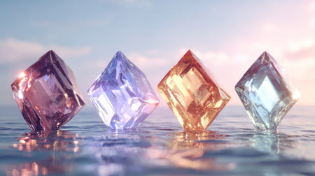 Four large, bipyramidal cut gemstones, rendered with translucent material and vibrant internal colors, are resting partially submerged in a body of water. The scene is set outdoors, likely during sunrise or sunset, featuring soft natural light, subtle clouds in the background sky, and distinct reflections of the gems and light on the disturbed water surface.
