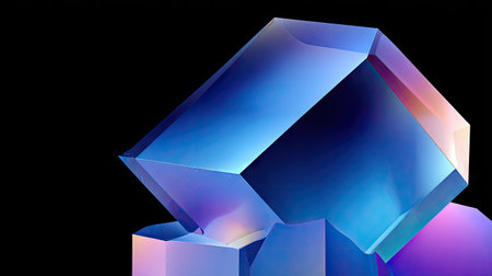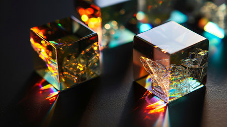 crystal glass cubes with refraction and holographic effect isolated on black background