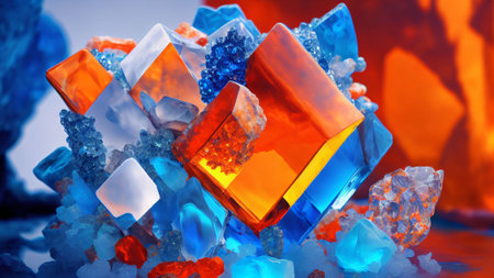 A colorful array of ice cubes in various shades of red, yellow, and blue. The cubes are arranged in a way that creates a visually appealing and vibrant display