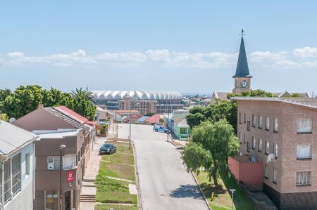 PORT ELIZABETH, SOUTH AFRICA - FEBRUARY 27, 2016: A view of Kirkwood Street in North End in Port Elizabeth with the Nelson Mandela Bay Stadium in the back