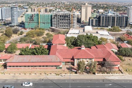 WINDHOEK, NAMIBIA - JUNE 17, 2017: An aerial view of the National Museum in Windhoek, previously the Emma Hoogenhout Primary School. Part of the central business district is in the back