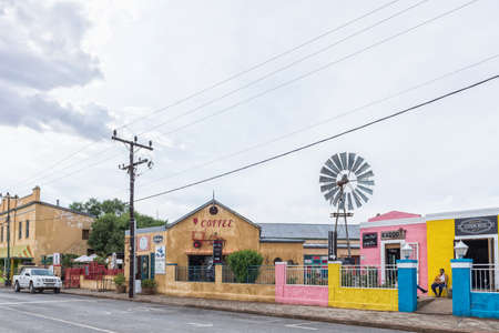 WILLOWMORE, SOUTH AFRICA - APRIL 21, 2021: A street scene, with businesses and a vehicle, in Willowmore in the Eastern Cape Province. A windmill is visible