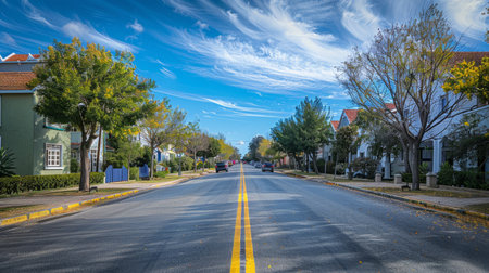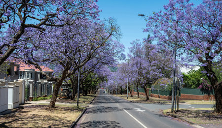 Tall Jacaranda trees lining the street of a Johannesburg suburb in the afternoon sunlight, South Africa