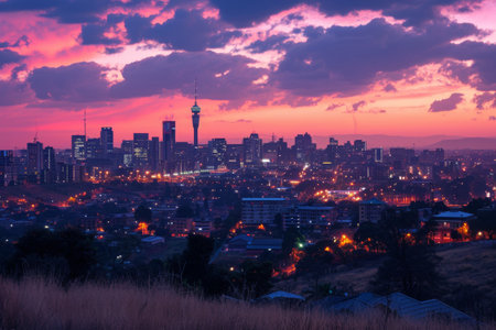 This photo captures a nighttime view of a city from a hill, showcasing the city lights and urban skyline, Johannesburg's skyline in the shadow of sunset, AI Generated