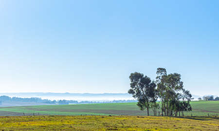 Rural landscape. Farm area in Brazil. Agriculture and livestock fields. Agricultural region in the pampa biome. Landscape of the South American pampas. borders of Brazil, Uruguay and Argentina.