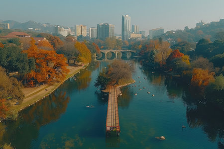 Peaceful River in Autumn Splendor with Vibrant Trees and City Skyline