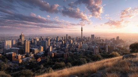 Johannesburg cityscape at sunset, showcasing a panoramic view of the urban skyline with high-rise buildings, the iconic Hillbrow Tower, and a foreground of grassy hills, highlighting the contrast between nature and urban development.