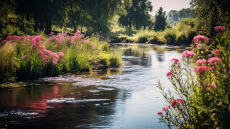 Calm river with colorful wildflowers on shore