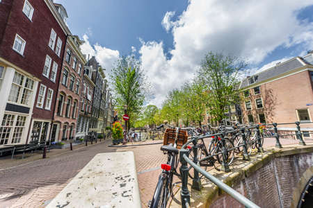 Bicycles parked on a canal bridge. Amsterdam traditional brick facade houses background. Sunny day, Netherlands Holland