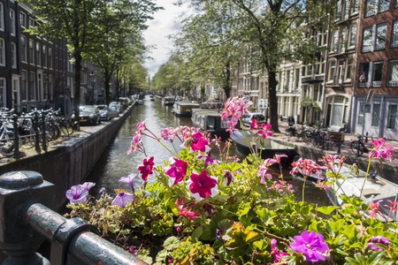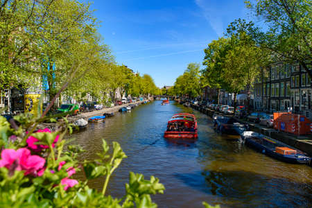 AMSTERDAM, NETHERLANDS - May 26, 2019: Quiet canal side in Amsterdam with barges, houseboats and flowers