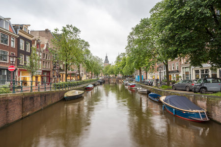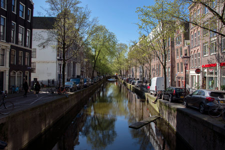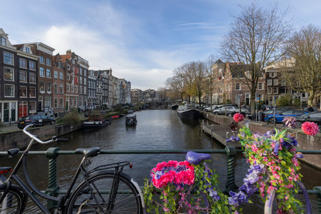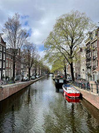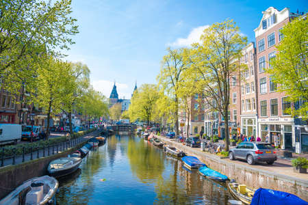 Amsterdam, Netherlands - March, 12, 2017. Scenic canal with traditional dutch architecture in Amsterdam, Netherlands