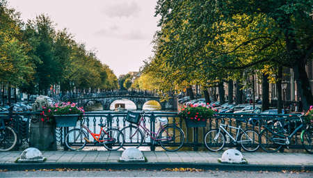 Amsterdam, Netherlands. Bikes on the bridge canal of Amsterdam city. Typical Amsterdam transport, bicycles streets. Picturesque urban street view in Netherlands