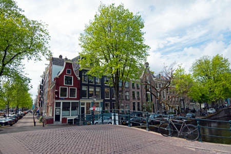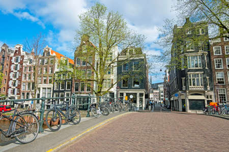 Amsterdam, Netherlands - March 31, 2016 : Beautiful view of Amsterdam canals with bridge and typical dutch houses. Amsterdam, Netherlands
