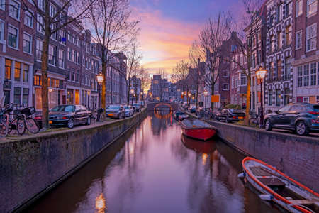 City Canal with glowing lights early in the morning. Amsterdam. Netherlands.