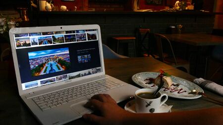 MAR 19, 2017, MOSCOW, RUSSIA: Browsing photo of Prague in Google - man using Laptop planning travel, time lapse