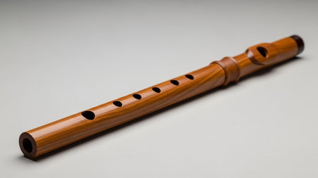 A stunning wooden flute lies elegantly on a soft surface, illuminated by soft light, emphasizing its intricate design and craftsmanship that embodies musical elegance.