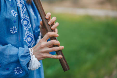 Woman playing woodwind wooden flute - ukrainian sopilka outdoors. Folk music, culture concept. Musical instrument. Lady in traditional embroidered shirt - blue vyshyvanka.