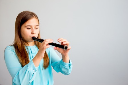 A gorgeous young woman sitting and playing the flute piccolo Close-up