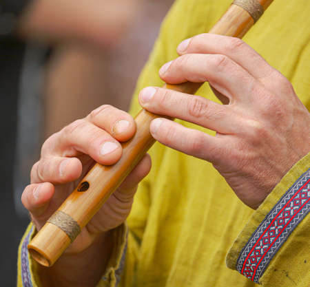 Young man playing on woodwind wooden flute - ukrainian sopilka