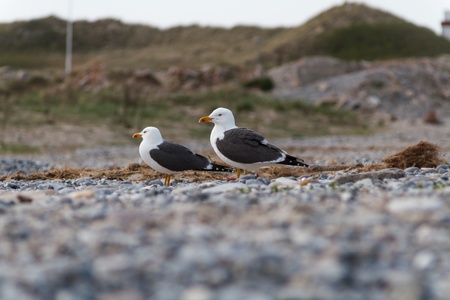 Seagulls on Helgoland with pebbles and dune