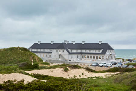 A house on a dune overlooking the ocean under a cloudy sky. The composition features a house structure atop a sandy dune with weathered grass in the foreground. The sky is partly cloudy, offering a panoramic view of the beach and ocean. Suitable for commercial and editorial purposes this image depicts tranquility and solitude.