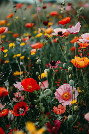 Vibrant poppy flowers bloom on a spring backyard. Vertical shot of mixed colors of plants in city park or botanical garden. Flora under the sun, creating a picturesque setting of nature