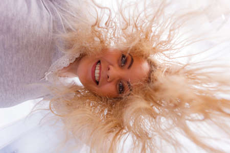 Happy woman having wet blonde hair. Positive clean female after taking a shower feeling clean and relaxed. Unusual crazy bottom angle.