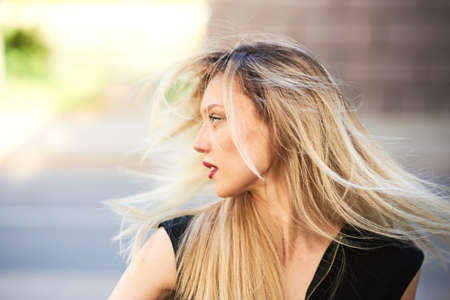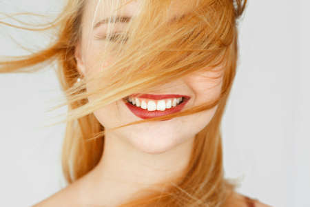 Blonde girl with red lips smiles while her hair flies with the air