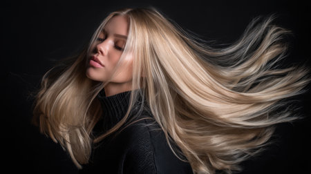 Woman with long, flowing blonde hair is captured in motion against dark background, showcasing elegance and beauty of her hairstyle. image conveys sense of freedom and grace