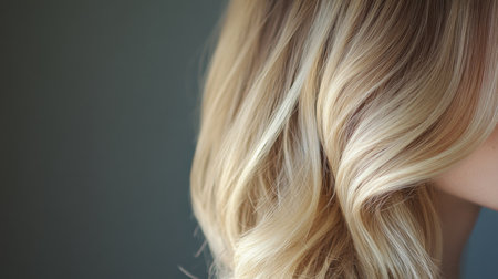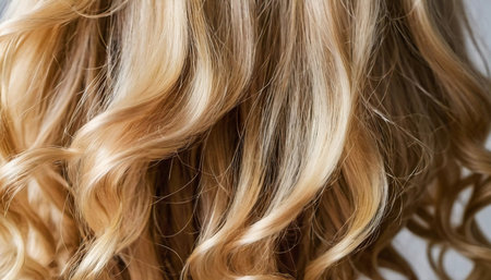 Soft, luminous curls highlighting the vibrant and healthy texture of the blond hair. The close-up captures the intricate details beautifully. Care cosmetics. Generative AI.
