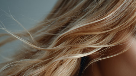 Flowing strands of long blonde hair softly shimmering in natural light