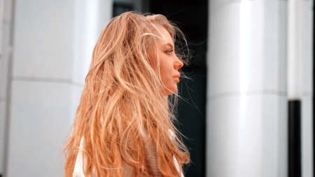 A girl in a white coat and a scarf straightens her thick hair. Strong wind. Business center in the background. Success