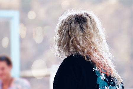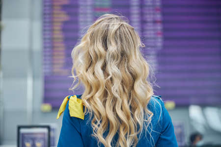 Hair care. The girl stands with her back, blonde