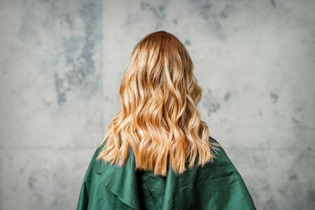 Blonde girl with long wavy hair, studio shot. Back view