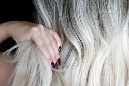 Blonde woman with red manicure straightens her long curly hair, back view. Female beauty and lush hairstyle