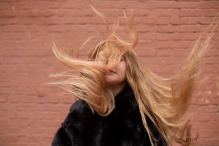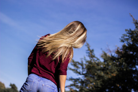 The girl is blonde with flying hair. For any purpose.